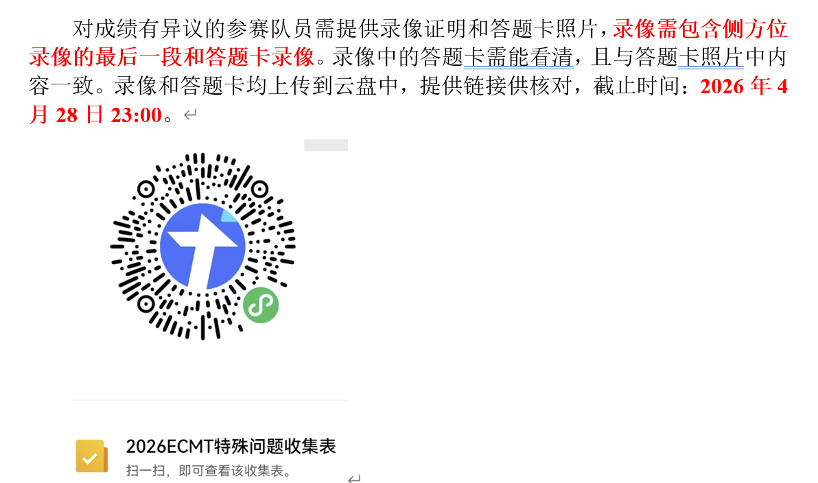 说明:对成绩有异议的同学请微信扫码填写信息,需提供完整的考试录像(可以用软件适当压缩,能看清屏幕为准),且必须包含提交答案的过程以及连续录制到的答题卡录像。